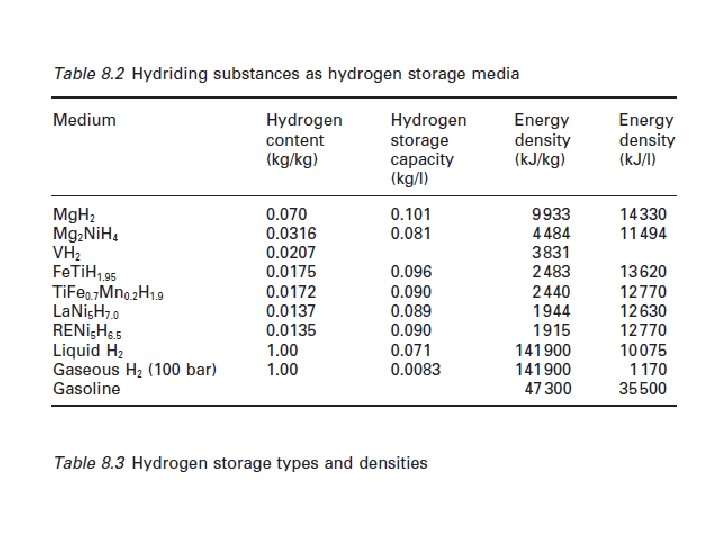 8. 3. 3 almacenamiento con hidruro metálico El hidrógeno puede formar hidruros metálicos con algunos metales y aleaciones. Durante la formación del hidruro de metal, las moléculas de hidrógeno se separan los átomos de hidrógeno y se insertan en los espacios dentro de la red cristalina de metales adecuados y / o aleaciones. De esta manera, el almacenamiento eficaz es comparable a la densidad de hidrógeno líquido. Sin embargo, cuando la masa del metal o aleación se tiene en cuenta, la densidad gravimétrica del almacenamiento del hidruro metálico es comparable a la de almacenamiento de hidrógeno a presión. La densidad de almacenamiento gravimétrico alcanzable es de aproximadamente 0, 07 kg de H 2/kg de metal para un hidruro de alta temperatura tales como Mg. H 2. Durante el proceso de almacenamiento, se libera calor, que debe ser eliminado con el fin de permitir la continuidad de la reacción. Durante el proceso de liberación de hidrógeno, el calor debe ser suministrada al tanque de almacenamiento. Una de las ventajas de almacenar el hidrógeno en hidruros es el aspecto de la seguridad: graves daños a un tanque de hidruro (por ejemplo, una colisión) no representaría un peligro de incendio, ya que el hidrógeno se quedaría en la estructura metálica. En la Tabla 8. 2 se enumeran algunas sustancias para hidruración adecuadas para su uso como medio de almacenamiento de hidrógeno, mientras que la Tabla 8. 3 proporciona una lista de tipos de almacenamiento de hidrógeno y densidades.