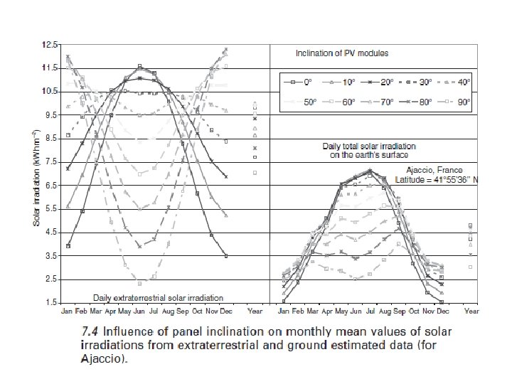 El conocimiento de la posición del sol permite que dos piezas de información útiles que se pueden obtener: la inclinación óptima de los paneles solares y un diagrama de energía solar para el cálculo de sombreado de los módulos fotovoltaicos. La posición solar se calcula a partir de diferentes ángulos, como la declinación, ángulo cenital y el ángulo horario (Iqbal, 1983). La inclinación óptima depende de la latitud, φ, en la distribución estacional de la carga y de las condiciones meteorológicas del lugar. Por largos períodos sin marcadas condiciones climáticas estacionales, la estimación de los efectos de inclinación se basan en cálculos de irradiación directa extraterrestre, con el fin de evitar el uso de un modelo de radiación difusa; en estas condiciones, la inclinación depende de φ , para invierno , φ + 10 ° y para verano φ - 10 °, (Duffie & Beckman, 2006). La figura 7. 4 muestra el impacto del ángulo de inclinación (por Ajaccio, Francia) en la irradiación solar extraterrestre y la tierra.