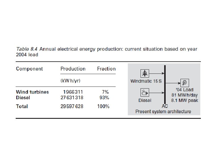 8. 4. 3 Estudio de caso: Karpathos Los resultados de un estudio de caso en la isla griega de Cárpatos (Giatrakos et al. , 2009) se presentan aquí. Los requerimientos de energía de la isla son provistos principalmente por generadores diesel existentes, que proporcionan una capacidad total de 12, 000 k. We. Se realizó un simulación en HOMER de las demandas de potencia de la isla, considerando los generadores eólicos con capacidad existente de 275 k. We para calcular el tamaño del generador diesel requerido para alcanzar un déficit cero de capacidad de producción anual. Esto dio lugar a una capacidad óptima de 8. 000 k. We, lo que demuestra que el actual 12 000 k. We garantiza un margen de capacidad de reserva del 50%. Un análisis financiero mostró un coeficiente niveladoo de rendimiento (COE) en 0. 231 € /k. W h, teniendo en cuenta una tasa de emisiones de CO 2 de 30€ /t, y calcula que la cantidad de diesel que se consume al año es 8’ 922, 170 litros. La penetración de la RES alcanzó el 6, 6% de la electricidad consumida anualmente (Tabla 8. 4). El total de gases de efecto invernadero (GHG) fue de 23, 958. 9 toneladas de CO 2.
