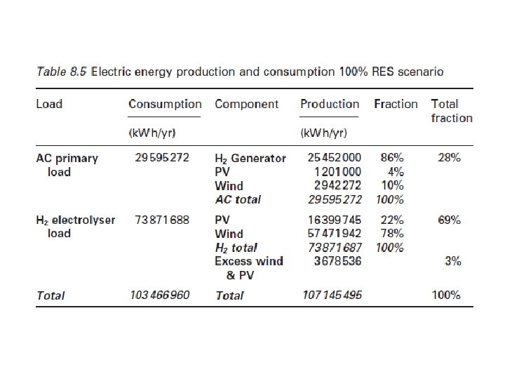 La cuestión más importante de este esquema de la tecnología propuesta es la completa independencia de la isla del diesel, a través de un sistema de energía 100% independiente basada únicamente en los recursos renovables (indígenas Kaldellis, 2007). En estas circunstancias, Karpathos puede incluso convertirse en una "comunidad sostenible", como lo define el Libro Blanco Europeo sobre Energías Renovables. Este escenario contempla la integración de la producción de hidrógeno y de las instalaciones de almacenamiento para hacer frente a la naturaleza intermitente de las energías renovables con re-electrificación basa en hidrógeno. Al mismo tiempo, los generadores diesel existentes se mantendrán como reserva. La implementación de un ciclo de almacenamiento de hidrógeno, para asegurar la cobertura de la demanda cuando disminuye la producción del RES, es una acción caro ya que la capacidad requerida del sistema RES debe llegar a 22 MW, tres veces el máximo anual, mientras que el 70% de la producción de electricidad total anual tiene que ser utilizado para la producción de hidrógeno (Tabla 8. 5).
