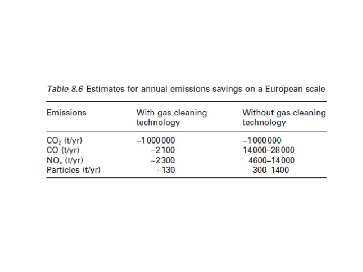 Las limitaciones de tamaño (hasta 300 k. We generación) y el tipo de energía del sistema (SAPS) elegido infl uencia con fuerza el impacto que se puede hacer en el medio ambiente a nivel europeo. Se partió del supuesto, para este estudio, que el 50% del segmento de mercado más grande, "las aldeas rurales, los asentamientos y las casas" (Zoulias et al, 2006). Podrían ser cubiertos por los sistemas de RES, también se suponía que este segmento tiene diesel generación de energía basada en, y el total (máximo) la demanda de energía suministrada por el diesel fue de alrededor de 1 TW h (~ 900 GW h). Esto es menos del 0, 0001% de la generación total de electricidad anual de aplicaciones estacionarias en Europa. El total de las emisiones anuales de CO 2 ahorrados por la introducción de sistemas de energía de hidrógeno (H autónomas-APS) en estos segmentos de mercado se estimó entonces en alrededor de 1 millón de toneladas de CO 2. El ahorro potencial de emisiones de CO 2, CO, NOx y partículas se resumen en la Tabla 8. 6.