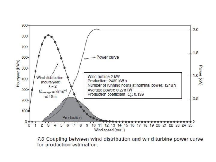 7. 2. 2 Viento fuente de energía La energía del viento por unidad de área de sección transversal durante un período de tiempo Dt es: donde el aire densidad ρa = 1, 23 kg m-3 a 15 ° C y al nivel del mar. La temperatura ambiente, presión y humedad del aire influyen en la densidad del aire. Esta energía no puede ser utilizado en su totalidad por una turbina de viento, ya que sólo la energía disponible entre el corte y corte -velocidades es útil. La salida de energía de una turbina eólica se obtiene mediante el acoplamiento de la velocidad del viento y la curva de distribución de probabilidad de la turbina de potencia, como se ve en la fig. 7, 6.