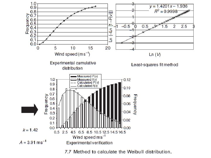 Las funciones de densidad de probabilidad de Weibull son de uso común y ampliamente adoptadas (Celik, 2003; Chang y Tu, 2007; . Ngala et al, 2007; Bagiorgas et al, 2007; . Elamouri y Ben Amar, 2008; Kaldellis, 2008), esta función es un caso especial de la distribución gamma y se caracteriza por su función de probabilidad densidad f (v) y la función de distribución acumulada F(v) en las fórmulas siguientes: donde A es el parámetro de escala (en ms-1), k es el parámetro de forma adimensional y V la velocidad del viento. El método más común para calcular los parámetros de la distribución de Weibull se basa en el uso de la ecuación 7, 4, realizando el cálculo logaritmo dos veces por los dos términos de la ecuación y luego se emplean un método de mínimos cuadrados para calcular los dos coeficientes, A y k (Fig. . 7, 7), que caracterizan el potencial eólico de un emplazamiento.