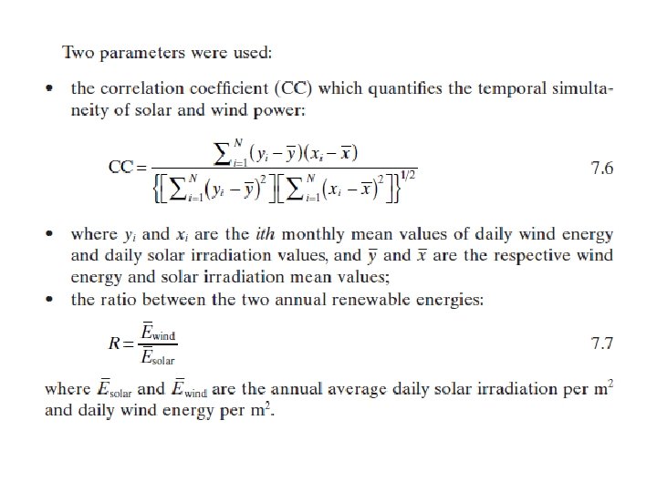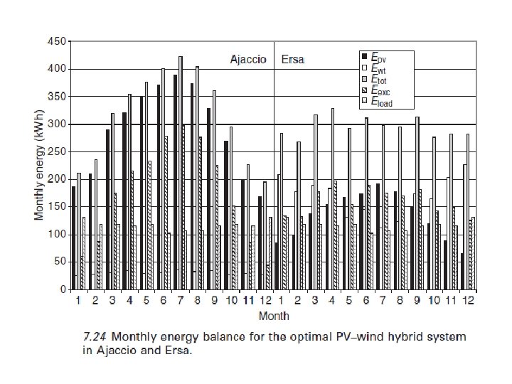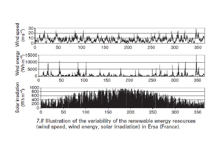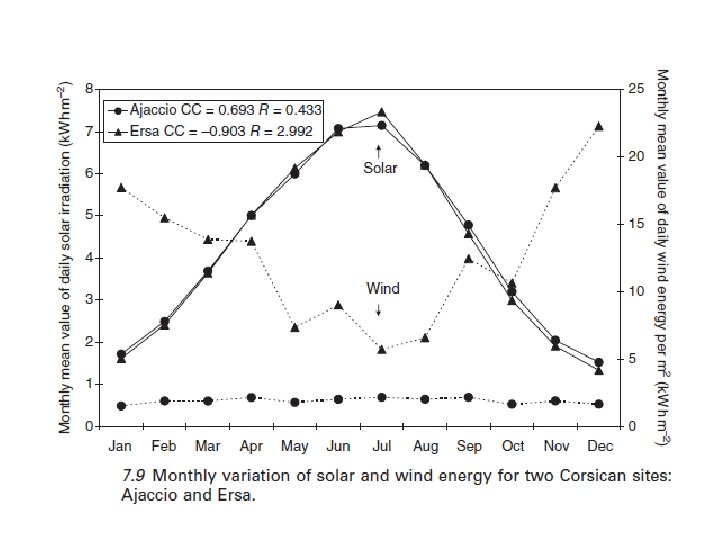 7. 2. 3 Complementariedad de los recursos renovables El mayor problema para un uso independiente de la energía eólica y energía solar es su discontinuidad: un sistema de energía solar por sí sola no puede proporcionar una fuente continua de energía debido a su baja densidad de energía, el periodo nocturno y durante el invierno, mientras que un sistema de energía eólica no puede satisfacer la demanda de carga constante, debido a las diferentes magnitudes de la velocidad del viento de una hora a otra. En general, las variaciones o fluctuaciones de la energía solar y la generación de energía eólica no coinciden con la distribución del tiempo de demanda de carga sobre una base continua. La naturaleza complementaria de los recursos eólicos y solares en USA fue examinado ya en 1981 por Aspliden (1981), y un estudio más reciente fue realizado por Reichling y analista Gregory Kulacki (2008). Se prestó especial atención a la complementariedad de las fuentes de energía en los sistema eólicos/PV (Aspliden, 1981; Katti y Khedkar, 2007; Gilau & Small, 2008; Mahmoudi et al, 2008; . Reichling y analista Gregory Kulacki, 2008). La variabilidad anual de estas dos fuentes se ilustra en la figura. 7, 8 (para Ersa, Francia).