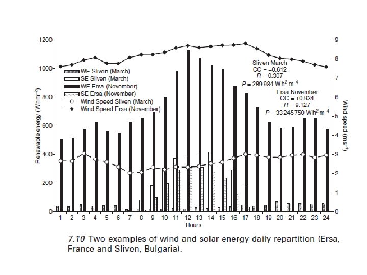 Cuando CC está alrededor de 1, las dos fuentes renovables varían de la misma manera. Para una buena complementariedad, CC debe estar cerca de la UNIDAD. La variabilidad espacial del recurso eólico es mucho mayor que la del recurso solar, por lo tanto: la R más alta, es el potencial renovable más sensible. Por ejemplo, los resultados para dos sitios en Corsos se muestra en la figura. 7. 9: Ersa tiene un buen potencial renovable y los dos recursos son complementarios, en Ajaccio, el recurso solar es casi el mismo de Ersa pero el potencial del viento es bajo y su distribución mensual es similar a la de la energía solar. Es importante ver el comportamiento de estos dos recursos en una escala diaria, ya que juega un papel importante en el tamaño de almacenamiento. La figura 7. 10 muestra la distribución mensual de los dos recursos renovables para Sliven, Bulgaria (con una buena complementariedad, pero el potencial renovable bajo), y Ersa, Francia (con la complementariedad es mala, pero con un buen potencial). Más específicamente, en la figura. 7, 10, R, P y los valores de CC se muestran para dos meses representativos para cada uno de los dos sitios.