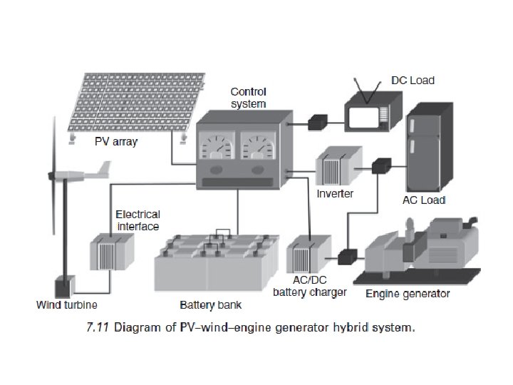 7. 3 Diseño y configuración de un sistema del de energía híbrido eólicofotovoltaico (PV) El concepto de un sistema de energía híbrido eólico-fotovoltaico se muestra en la fig. 7. 11. En esta configuración general, un generador de motor ha sido añadido. Los sistemas de conversión de energía eólica (WECS) y el sistema fotovoltaico son operados en paralelo con el fin de suministrar energía eléctrica a la carga, y el exceso de energía generada se suministra a las baterías. Para los casos de emergencia, cuando el viento / generación solar y la energía almacenada no son suficiente para alimentar la carga, el generador de motor de respaldo funciona y se utiliza para cargar la batería y/o para suministrar directamente a la carga.