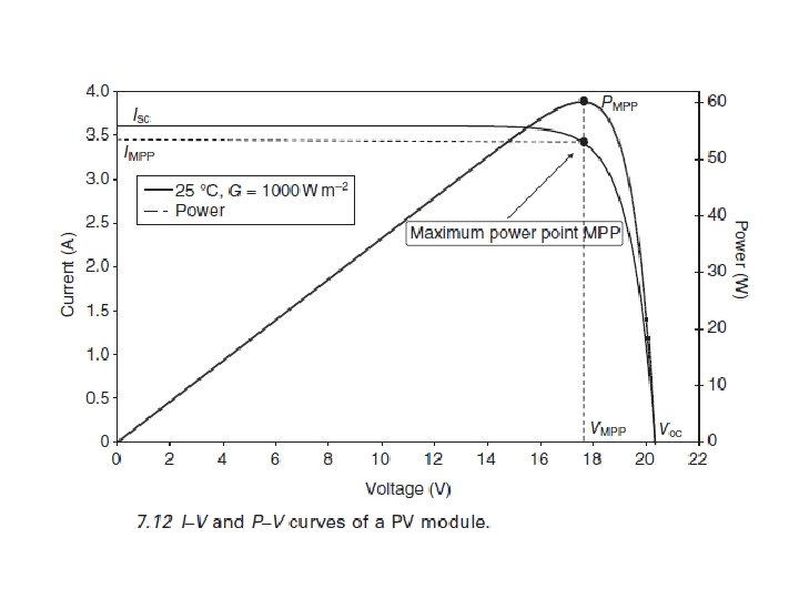 7. 4 Modelización y simulación de un viento-fotovoltaica (PV) del sistema híbrido de energía 7. 4. 1 del sistema PV La siguiente descripción se limita a los módulos solares de silicio cristalino, que representan aproximadamente el 90% de la producción mundial de energía fotovoltaica. Otras tecnologías, como el silicio amorfo, Cd. Te, cobreindio-diseleniuro (CIS) y las células en tándem se han desarrollado, pero su uso en sistemas de energía sigue siendo limitado. El rendimiento del módulo fotovoltaico es muy influidos por las condiciones climáticas, especialmente la radiación solar y la temperatura del módulo PV. La corriente de cortocircuito Isc y el voltaje de circuito abierto Voc son los dos principales parámetros de la curva I-V (Fig. 7. 12). La Isc es casi proporcional a la irradiación solar y Voc aumenta lentamente cuando aumenta la irradiancia solar. Cuando la temperatura aumenta el Voc conduce a una disminución de la energía eléctrica disponible máxima, a pesar de un pequeño aumento de la corriente de cortocircuito Isc. El punto de trabajo de un panel fotovoltaico depende de la característica de carga, cuando la batería está conectada, su voltaje impone el voltaje en el PV.