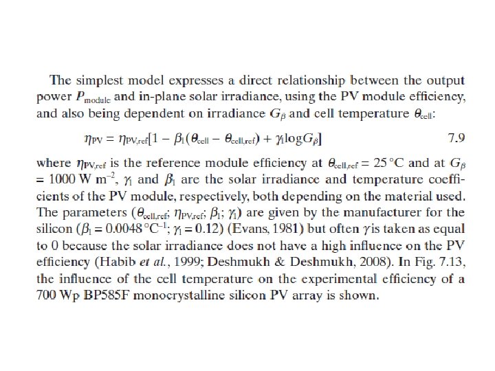 La ecuación característica del módulo fotovoltaico es una ecuación trascendental que no tiene solución analítica. Suponiendo que un MPPT se utiliza, las fórmulas para calcular el punto óptimo de operación de corriente y voltaje en condiciones arbitrarias, y el uso de parámetros de fácil acceso, tiene las siguientes formas (Lasnier et al, 1988; . Borowy y Salameh, 1996; Ai et al. , 2003): con α 0 y β 0 siendo los coeficientes de temperatura del módulo de corriente y tensión, respectivamente.