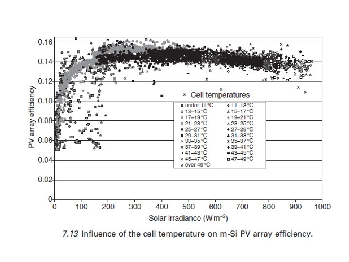 En todos estos modelos, la temperatura de la célula θcell aparece influyendo las características I-V y la eficiencia eléctrica del módulo PV. El método más común para determinar θcell consiste en utilizar la temperatura de funcionamiento normal de las células (NOCT) (calculado para una velocidad del viento v = 1 ms-1, una temperatura ambiente θa = 20 ° C y una irradiancia semiesférica Gβ = 800 W m-2 ) dado por fabricantes de módulos fotovoltaicos: Otros métodos para determinar la temperatura de la célula se dan por Jones & Underwood (2001) y Mattei et al. (2006).