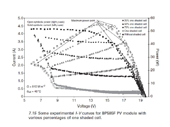 Si un módulo fotovoltaico está sombreado, efectos muy dramáticos se producen en su curva potencia-voltaje y, aunque sólo una fracción muy pequeña del módulo o celda esté sombreada, una reducción significativa de potencia se lleva a cabo. Esta sombra parcial puede ocurrir como resultado de las chimeneas, árboles, partes de otros edificios, etc, y se debe prestar especial atención a este problema a fin de evitar una alta reducción de rendimiento del sistema fotovoltaico (Hecktheuer et al, 2002. ; Eicker, 2003; Karatepe et al, 2007). . En la fig. 7, 15, se muestra la influencia de la sombra parcial de una célula en las curvas I-V y P-V. Con sólo el 50% de una célula sombreada (de las 36 células en serie), la potencia se reduce en un 25%, y con el 100% de una célula de la sombra, el poder cae en un 57%. Se debe prestar especial atención a este problema en el diseño de un sistema.