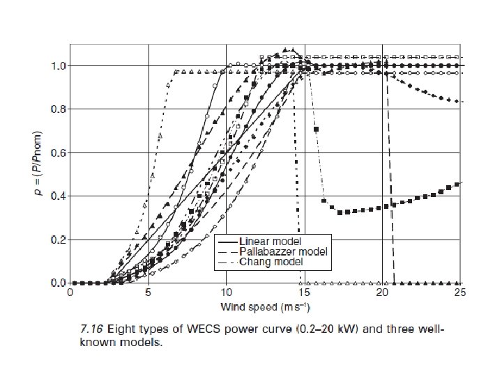 Un inventario de WECS de 0, 2 a 20 k. W disponibles en el mercado europeo se llevó a cabo. La forma de las curvas de potencia varían mucho y la potencia de salida WECS puede alcanzar un valor de 40% mayor que la potencia nominal PWECSrated, definida por el fabricante. Entre las 59 curvas de potencia estudiadas, ocho tipos de WECS fueron seleccionados (ver Fig. 7. 16; . La Potencia de energía eléctrica ha sido dividida por la potencia nomina PWECSrated para una mejor comparación). Tres modelos por lo general utilizados en el sistema híbrido de tamaño también se muestran: el modelo lineal, modelo de Pallabazzer (Pallabazzer, 1995; Underwood et al, 2007). Y el modelo de Chang (Chang y Tu, 2007). Estos modelos no son representativos de WECS pequeñas y medianas y, teniendo en cuenta la importancia de las curvas de potencia en el tamaño del sistema, es preferible utilizar curvas de potencia reales WECS. Para obtener la potencia de salida WECS, la velocidad del viento medida a 10 m debe ser calcula la altura del buje, utilizando la ecuación. [7, 5] y luego se acopla a las curvas de potencia WECS.