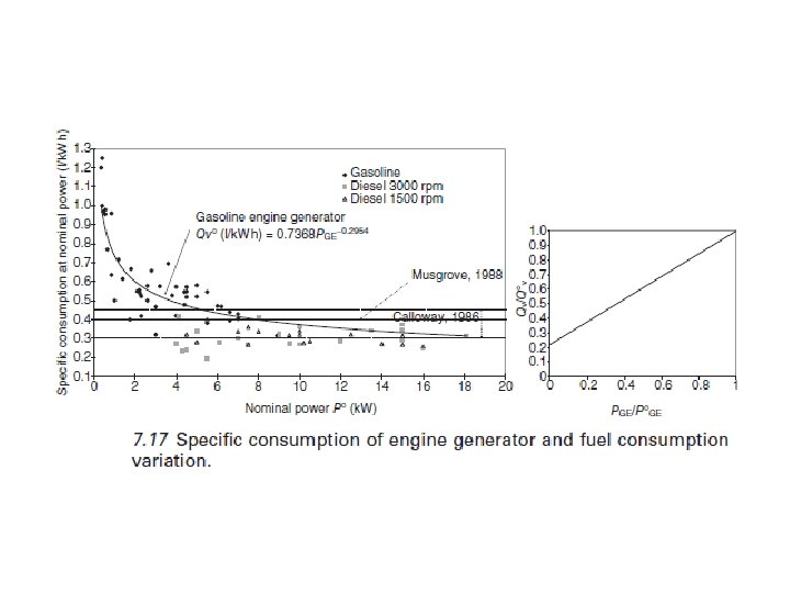 En la primera configuración, el generador tiene una capacidad nominal mayor que en el segundo caso y, a menudo funciona a carga parcial incluso si se carga la batería simultáneamente y, además, consume más combustible. En la segunda configuración, el generador se elige de tal manera que siempre se ejecuta a plena carga, es decir, con una eficiencia superior. Una relación lineal vincula el consumo de combustible QV y la energía producida PEG (Fig. 7. 17). El consumo de combustible sin carga de un generador de motor pequeño puede ser una fracción alta del consumo Q 0 v a plena carga de combustible (25 -40%) (Notton et al, 1996; . Kaldellis, 2007). Así, la eficiencia del generador es mayor con carga elevada que en las cargas parciales y bajas. El consumo de combustible específico Q 0 v depende de varios parámetros que definen la calidad del motor. Varía mucho para baja potencia nominal (<5 k. V A), pero es relativamente constante para potencias elevadas (Calloway, 1986; De L. Musgrove, 1988) (Fig. 7. 17).