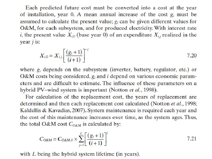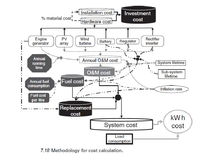 7. 4. 7 Cálculo de costos El costo de k. Wh depende de muchos factores, tanto físicos (configuración, la estrategia, el tamaño del subsistema, la potencia y la energía, la implantación del sitio, el potencial de las energías renovables, etc) y económicos (tasa de inflación y la tasa de descuento). El costo del ciclo de vida (LCC) es la suma del costo de instalación inicial (material e instalación), los costos de operación y mantenimiento, costos de reemplazo y los costos de combustible, si un generador auxiliar está presente (ver fig. 7. 18). En adición a todos estos costos en conjunto, cualquiera de ellos que se producen después del día de instalación debe ser actualizado, es decir, todos los costos deben expresarse en su valor actual. Sólo alguna información se da aquí y, para una explicación más detallada, se recomienda acudir a la literatura (ver Notton et al, 1998; . Kaldellis y Kavadias, 2007; Kaldellis et al, 2007; . . Diaf et al, 2008 a). El coste de material se da a menudo por la unidad de potencia o energía, y la literatura ofrece una amplia gama de supuestos para la estimación de los costes de hardware (Notton et al, 1998; . . Diaf et al, 2008 a). El precio específico de cada subsistema (campo fotovoltaico, aerogeneradores, baterías, transformadores eléctricos, etc) depende del tamaño del subsistema y se expresa generalmente por una ley de potencias (Kaldellis y Kavadias, 2007; . Kaldellis et al, 2007 , Diaf et al. , 2008 b).