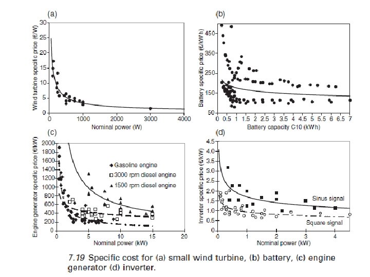 La figura 7. 19 muestra la influencia del tamaño sobre los costos específicos de pequeñas turbinas de viento, baterías, generadores de motores e inversores de los datos recogidos en el mercado francés. Formulaciones generales para la estimación de los precios específicos se dan en las referencias (ver Notton et al, 1998; . Kaldellis y Kavadias, 2007; Kaldellis et al, 2007; . . Diaf et al, 2008 a). La instalación se estima a menudo como un porcentaje de los costes de material (Notton et al, 1998; . . Diaf et al, 2008 b). La literatura da una gama muy amplia de porcentajes de PV y los costos de hardware del subsistema de viento, que van desde 15% a 50%, con el valor promedio de alrededor de 25%. Los costos de hardware e instalación constituyen los costos de inversión. El costo anual de O & M, CO&M, 0, generalmente se calcula como un porcentaje del costo de la inversión, o como un costo con una mezcla de partes fijas y variables (la parte variable de alrededor de 1% por año para PV y un 3% anual para el viento). Para un motor de combustible, los costos de operación y mantenimiento dependerán en parte de el tiempo de ejecución anual (Notton et al, 1998; . Kaldellis y Kavadias, 2007).