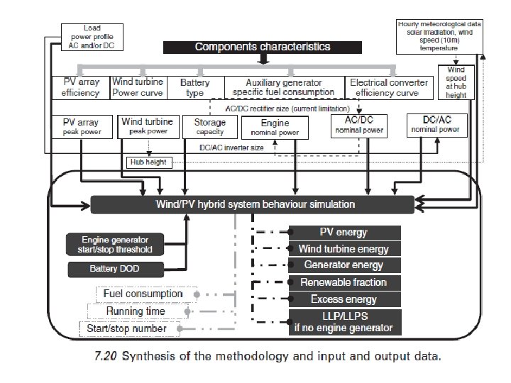 7. 5. 3 Optimización de dimensionamiento El dimensionamiento óptimo generalmente se calcula sobre una base horaria, para tener en cuenta en la distribución temporal de la carga y las fuentes de energía. Para hacer frente a una carga de energía con un valor dado LLPS, varias configuraciones del sistema híbrido son posibles. Algunas configuraciones no son técnicamente viables (de almacenamiento muy grande, la incompatibilidad entre la potencia del generador y el tamaño de almacenamiento, etc. ) El sistema optimizado debe cumplir con la demanda de energía con costos mínimos, con el uso mínimo de combustible, o con el mínimo período de amortización (una comparación de la energía producida con el contenido de energía de todo el sistema). Nema et al. (2009) escribe que las diversas técnicas de optimización se utilizan en la literatura para calcular el diseño óptimo de sistemas híbridos, tales como programación lineal, un enfoque probabilístico, técnicas iterativas, programación dinámica y multi-objetivo de algoritmos genéticos. La evaluación del costo del sistema eólico/PV que utiliza métodos de costeo en el ciclo de vida anualizado es un paso importante en el tamaño del sistema y, de hecho, a menudo es el principal criterio de optimización utilizado en la literatura. Utilizando presupuestados optimizados del sistemas aumenta el atractivo económico de estos y su aceptación por parte de los usuarios.