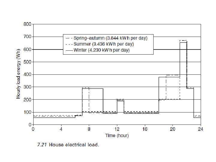 7. 6 Sistema de energía híbrido eólico-fotovoltaico: estudios de caso La figura 7. 21 presenta una carga eléctrica de CA para un hogar. Los sistemas híbridos eólicos-PV (sin un generador auxiliar) se encuentran en lugares distantes, a unos 130 km de distancia: en Ajaccio (un sitio no con mucho viento con una velocidad de viento promedio anual de 3, 5 m/s), y en Ersa (un sitio de mucho viento , con una velocidad media anual del viento de 7, 11 m/s). El potencial de energía renovable de estos dos sitios se muestra en la fig. 7. 9, el potencial solar es casi igual, pero el potencial eólico es muy diferente. El sistema de híbrido eólico-PV fue dimensionado para satisfacer la carga con un LLPS iguale a cero, es decir, toda la carga se cumplen sin interrupción. Para cada configuración (generador fotovoltaico de potencia máxima, turbina eólica de potencia nominal, capacidad de la batería) el costo de generación de electricidad Ck. Wh (€ / k. Wh) fue calculado utilizando las hipótesis presentadas en la Sección 7. 4. 6.