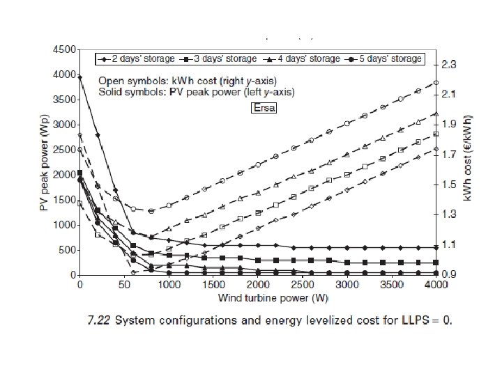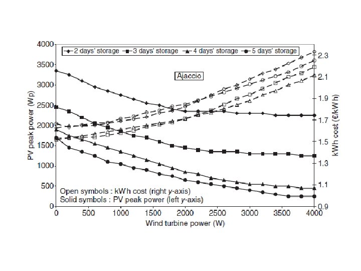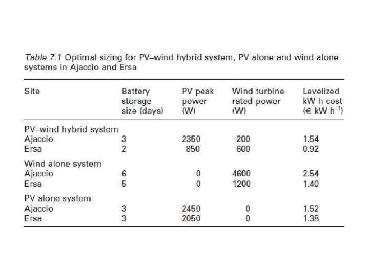 La figura 7. 22 muestra el subsistema de energía fotovoltaica y eólica tamaños subsistema turbina (en el eje izquierdo) y los correspondientes costos nivelados k. W h (en el eje derecho), por varias baterías con tamaños de almacenamiento diferentes (de 2 a 5 días de almacenamiento). Para Ajaccio, un sitio no-ventoso, la "mejor" configuración encontrada es de 3 días de almacenamiento, mientras que para Ersa, la "mejor" configuración es por sólo 2 días de almacenamiento. Las configuraciones óptimas para un sistema híbrido eólico-fotovoltaica, para la energía fotovoltaica sola y eólica por sí sola, se dan en la Tabla 7. 1. El tamaño de la batería disminuye cuando un sistema híbrido se utiliza, dondequiera que el sitio este, y es una de las principales ventajas de utilizar sistemas híbridos porque el banco de baterías representa un alto porcentaje del total de costos nivelado de generación. Kaldellis et al. (2006) obtuvieron las mismas conclusiones que muestran que la introducción de paneles fotovoltaicos en un sistema de energía eólica reduce considerablemente las dimensiones completas de instalación y reduce los costes operativos correspondientes debido a la reducción significativa de la capacidad de la batería impuesta.