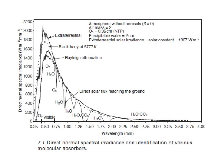 7. 2. 1 El recurso de la energía solar En cualquier sistema de conversión de energía solar, el conocimiento de la radiación solar global es muy importante para el diseño óptimo y la previsión de rendimiento del sistema. La radiación solar llega a la superficie de la Tierra en un espectro de longitudes de onda, desde rayos X a ondas de radio, el Sol irradia como un cuerpo negro a 5777 K, sin embargo, el 99, 9% de la energía emitida es de entre 0, 2 y 8 micras. Cada longitud de onda posee una capacidad distinta disponibilidad y transformación. En los sistemas PV, el rango de longitudes de onda útiles es entre 0, 35 y 1, 1 micras para una célula fotovoltaica de silicio pero, generalmente, la irradiación solar global se mide en su espectro completo para los estudios de sistemas fotovoltaicos (usando un piranómetro o sensor de radiación de silicio). La diferencia observada en los niveles de irradiación espectral entre la parte superior de la atmósfera y la superficie de la Tierra es debido a la absorción que tiene lugar por varios compuestos químicos, tales como O 2, O 3, H 2 O y CO 2, por aerosoles y por dispersión de Rayleigh (fig. 7. 1). Debido a los efectos atmosféricos, la radiación solar en la superficie de la Tierra consta de dos componentes: la radiación solar directa (sin cambio de dirección), y la radiación difusa recibida desde el cielo, cuando un colector solar está inclinado, recibe un tercer componente: el albedo que es la radiación reflejada por el suelo (Fig. 7. 2).