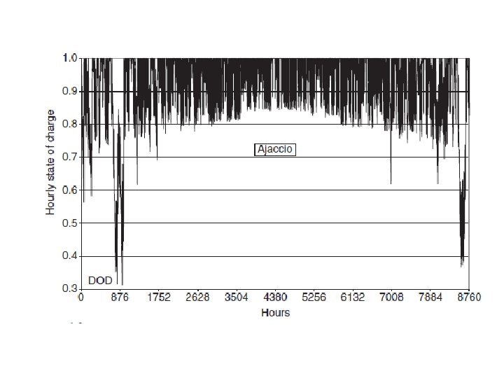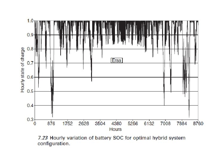 Un sistema híbrido eólico-PV es muy adecuado para Ersa en comparación con los otros dos sistemas, y el costo k. Wh se reduce en un 35%. Para Ajaccio, un sistema fotovoltaico solo es más adecuado porque el potencial del viento en ese sitio no es suficiente para la adición de una turbina de viento, y no proporcionaría ningún beneficio a la rentabilidad del sistema de producción, pero se traduciría en un aumento en la complejidad del sistema. Para las configuraciones óptimas del sistema híbrido, la evolución del SOC para un año se representa en la figura. 7. 23. A pesar de que el mínimo SOC alcanzado por los dos sistemas es el mismo, la variación del SOC difiere de un sitio a otro. Como Ai y col. (2003) han dicho, utilizando un sistema híbrido eólico-fotovoltaico aumenta la vida útil de las baterías notablemente en comparación con la utilización de cualquiera de un sistema eólico o una instalación fotovoltaica solo, porque el régimen de carga es más apropiado, la prolongación de la duración de la batería se reduce los costos de la producción de electricidad.