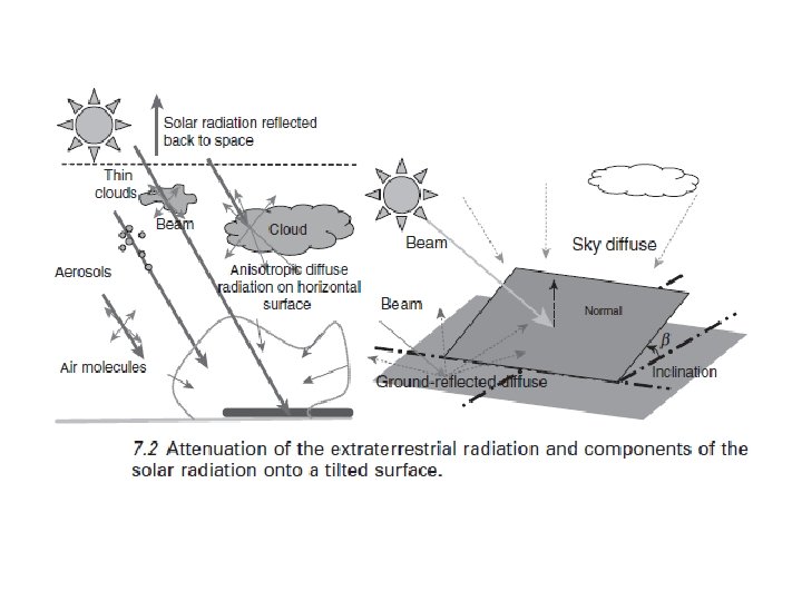Los componentes de la radiación solar para cielos despejados y nublados se muestra en la figura. 7, 3. La radiación solar global horizontal es la forma más comúnmente medida. Dependiendo del objetivo (ya sea por tamaño, comportamiento de simulation, etc) el tiempo de paso de los datos meteorológicos útiles varía de horas a las medias diarias de datos mensuales. . La irradiación solar sobre superficies no horizontales es mucho menos disponible, y es difícil de modelar, debido al efecto de la anisotropía de la radiación difusa sobre la cúpula del cielo. La conversión de la radiación solar a partir de la horizontal al plano inclinado se realiza mediante el uso de modelos precisos de valores medios mensuales (INES, 2009), mientras que los métodos menos confiables se utilizan para los datos medidos sobre una base horaria (Notton et al. , 2006). Además, los datos solares también se pueden encontrar en la web (NASA, 2009; NREL, 2009; Universidad de Massachusetts Lowell, 2009).