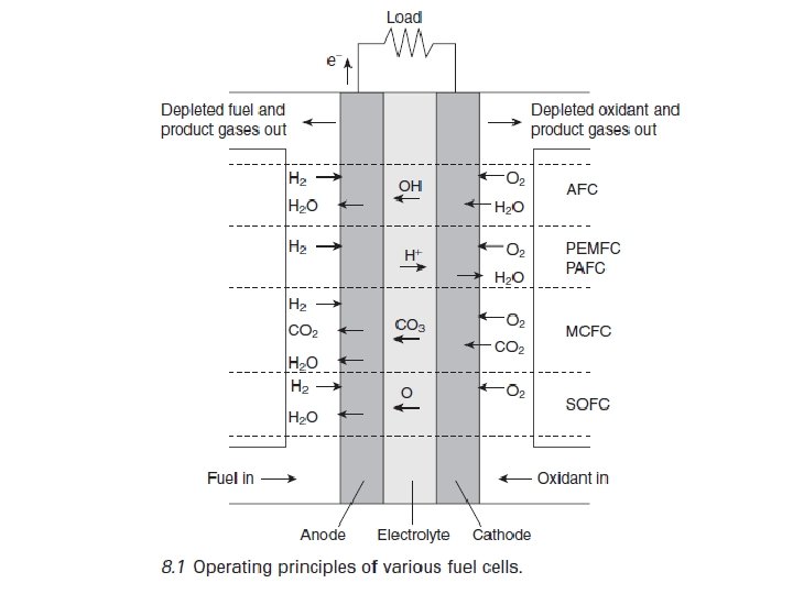 Las principales reacciones que tienen lugar en el ánodo y el cátodo de estos FCs se presentan en la Tabla 8. 1. Un FC típico consta de un electrolito, en contacto con dos electrodos porosos. Las reacciones electroquímicas ocurren en la interfaz triple entre el electrodo poroso de electrolito, y reactivos. Bajo temperatura FC (AFC, PEMFC, PAFC) requieren electrocatalizadores nobles para lograr velocidades prácticas de reacción en el ánodo y el cátodo. Alta temperatura FC (MCFC y SOFC) también pueden utilizar CO y CH 4 como combustible.