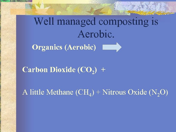 Well managed composting is Aerobic. Organics (Aerobic) Carbon Dioxide (CO 2) + A little Methane (CH 4) + Nitrous Oxide (N 2 O)