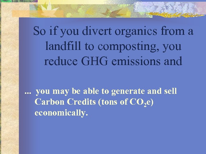So if you divert organics from a landfill to composting, you reduce GHG emissions and. . . you may be able to generate and sell Carbon Credits (tons of CO 2 e) economically.