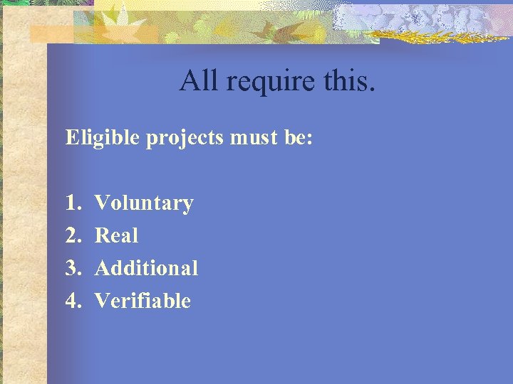 All require this. Eligible projects must be: 1. 2. 3. 4. Voluntary Real Additional Verifiable