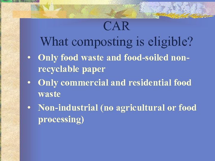 CAR What composting is eligible? • Only food waste and food-soiled nonrecyclable paper • Only commercial and residential food waste • Non-industrial (no agricultural or food processing)