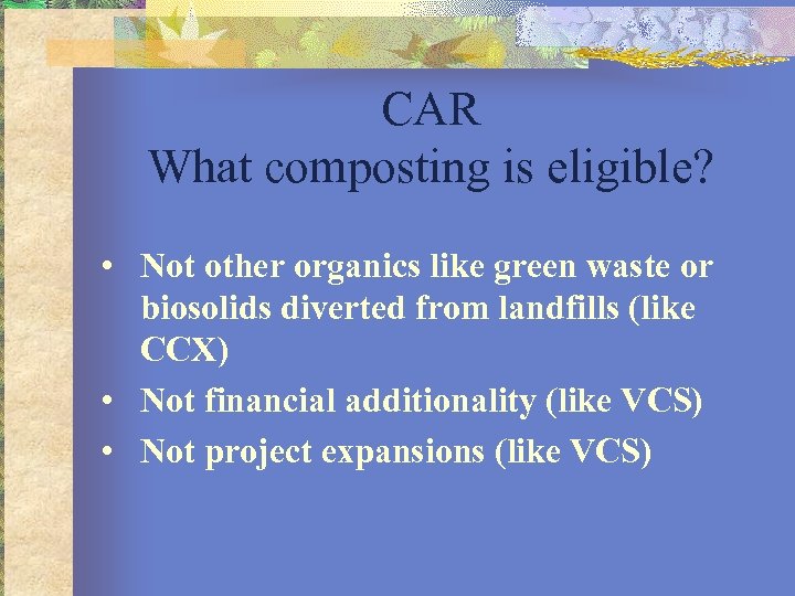 CAR What composting is eligible? • Not other organics like green waste or biosolids diverted from landfills (like CCX) • Not financial additionality (like VCS) • Not project expansions (like VCS)