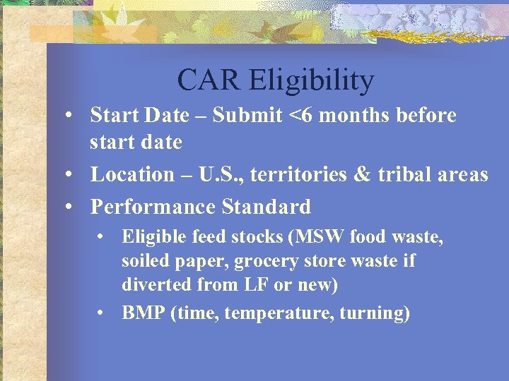 CAR Eligibility • Start Date – Submit <6 months before start date • Location – U. S. , territories & tribal areas • Performance Standard • Eligible feed stocks (MSW food waste, soiled paper, grocery store waste if diverted from LF or new) • BMP (time, temperature, turning)