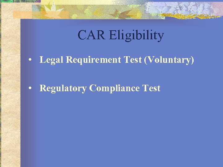 CAR Eligibility • Legal Requirement Test (Voluntary) • Regulatory Compliance Test