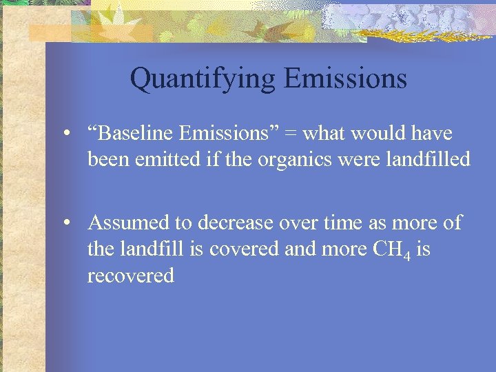 Quantifying Emissions • “Baseline Emissions” = what would have been emitted if the organics were landfilled • Assumed to decrease over time as more of the landfill is covered and more CH 4 is recovered