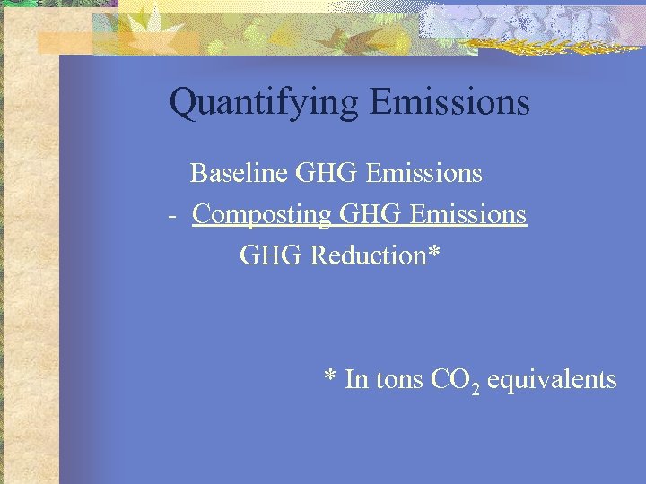 Quantifying Emissions Baseline GHG Emissions - Composting GHG Emissions GHG Reduction* * In tons CO 2 equivalents