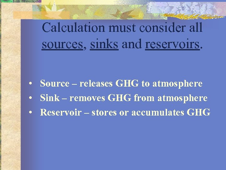 Calculation must consider all sources, sinks and reservoirs. • Source – releases GHG to atmosphere • Sink – removes GHG from atmosphere • Reservoir – stores or accumulates GHG