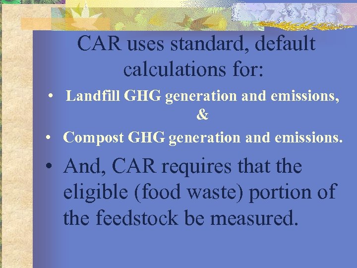 CAR uses standard, default calculations for: • Landfill GHG generation and emissions, & • Compost GHG generation and emissions. • And, CAR requires that the eligible (food waste) portion of the feedstock be measured.