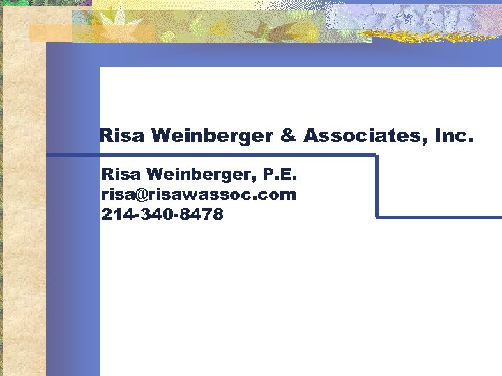 Risa Weinberger & Associates, Inc. Risa Weinberger, P. E. risa@risawassoc. com 214 -340 -8478