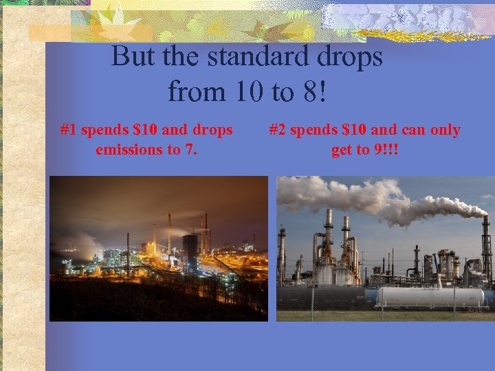 But the standard drops from 10 to 8! #1 spends $10 and drops emissions to 7. #2 spends $10 and can only get to 9!!!