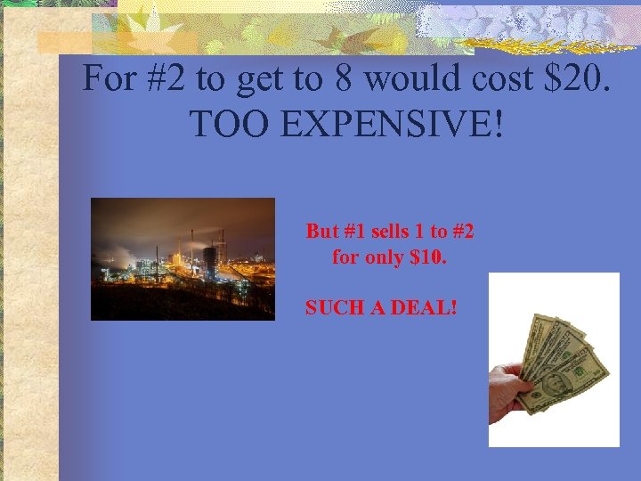 For #2 to get to 8 would cost $20. TOO EXPENSIVE! But #1 sells 1 to #2 for only $10. SUCH A DEAL!