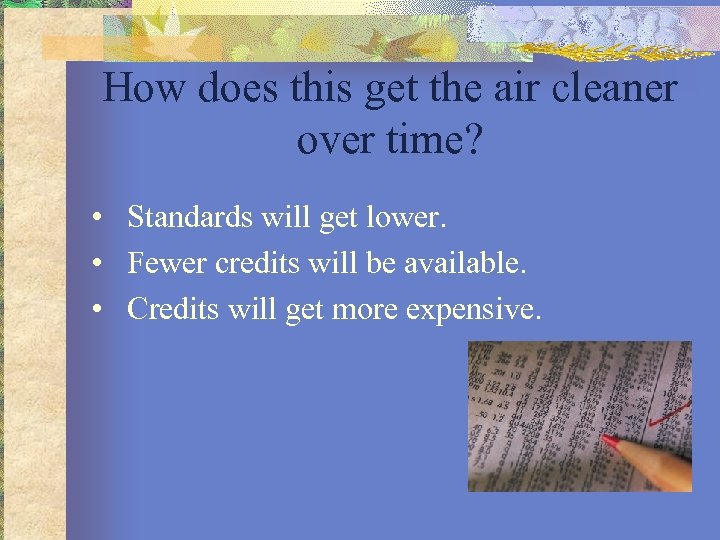 How does this get the air cleaner over time? • Standards will get lower. • Fewer credits will be available. • Credits will get more expensive.