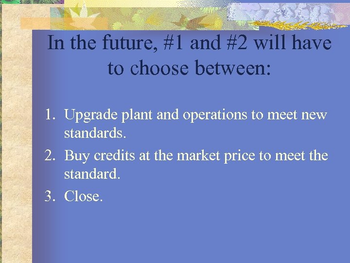 In the future, #1 and #2 will have to choose between: 1. Upgrade plant and operations to meet new standards. 2. Buy credits at the market price to meet the standard. 3. Close.