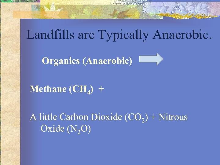 Landfills are Typically Anaerobic. Organics (Anaerobic) Methane (CH 4) + A little Carbon Dioxide (CO 2) + Nitrous Oxide (N 2 O)