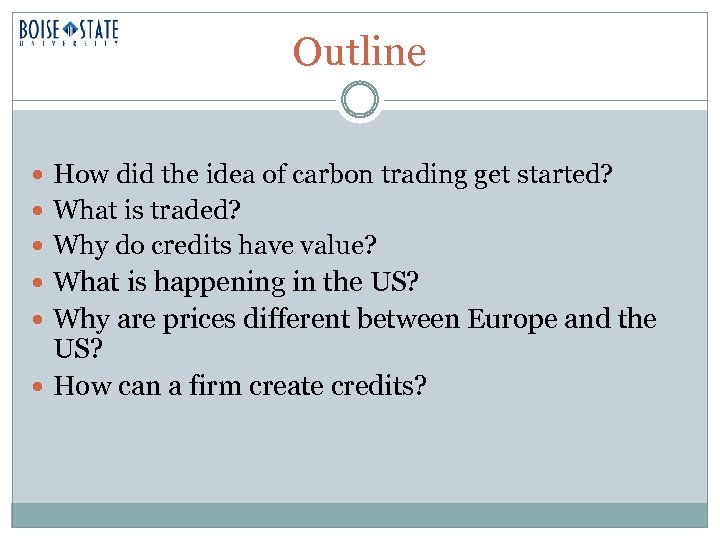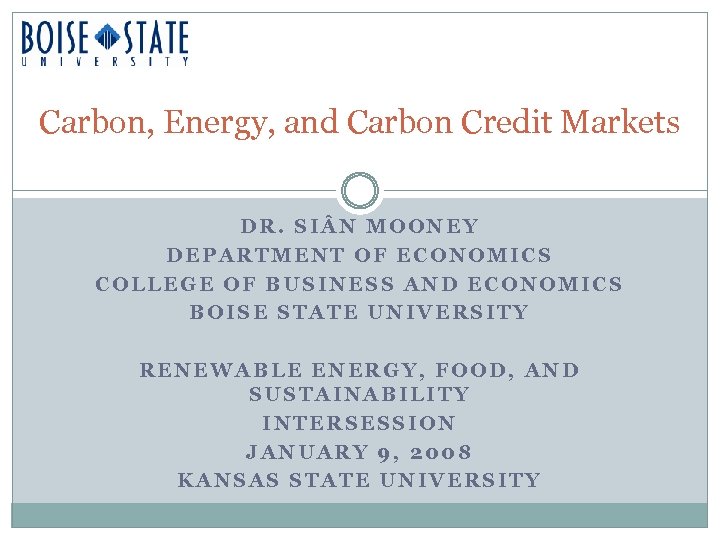 Carbon, Energy, and Carbon Credit Markets DR. SI N MOONEY DEPARTMENT OF ECONOMICS COLLEGE OF BUSINESS AND ECONOMICS BOISE STATE UNIVERSITY RENEWABLE ENERGY, FOOD, AND SUSTAINABILITY INTERSESSION JANUARY 9, 2008 KANSAS STATE UNIVERSITY