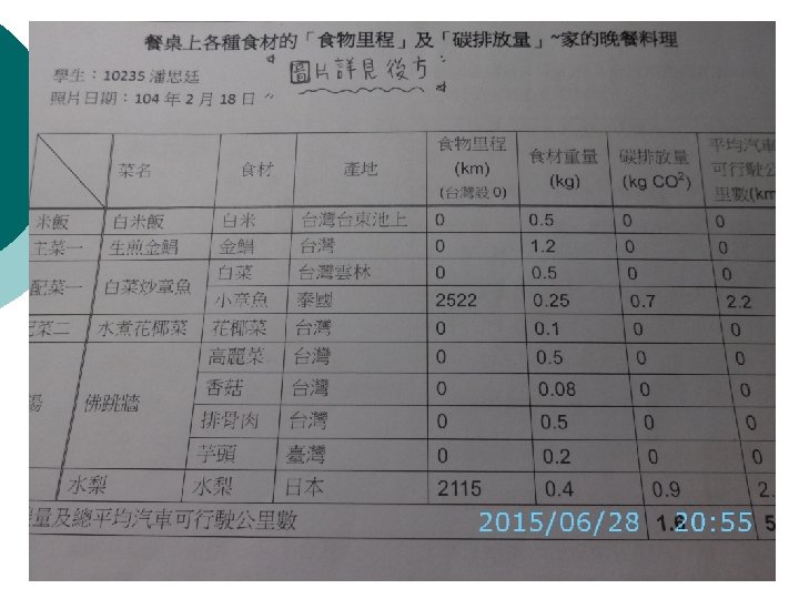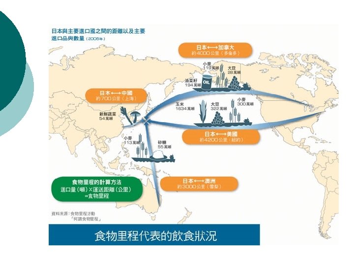 Food Mileage of Foods found in the Supermarket Rice about 584 km. (from Tatung) ¡ Fish about 256 km. (from Chiayi) ¡ Vegetable about 228 km(from Yunlin) ¡ Taco about 2522 km(from Thailand) ¡ Cauliflower about 228 km(from Yunlin) ¡ Pear about 2115 km(from Japan) ¡