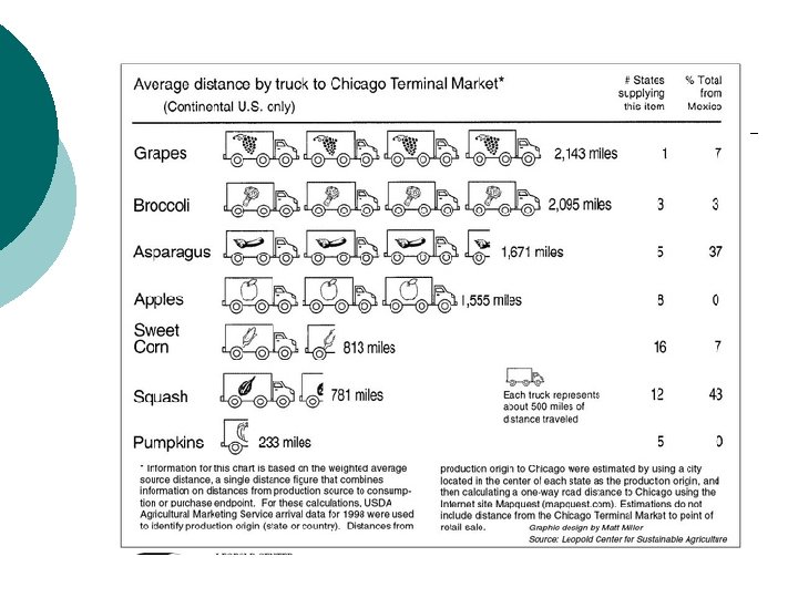 What is “Food Miles” ? ¡ It is the delivery distance where the food is produced and transported to the consumer’s hands (or mouth). ¡ Used to understand the impact of food production to the environment.