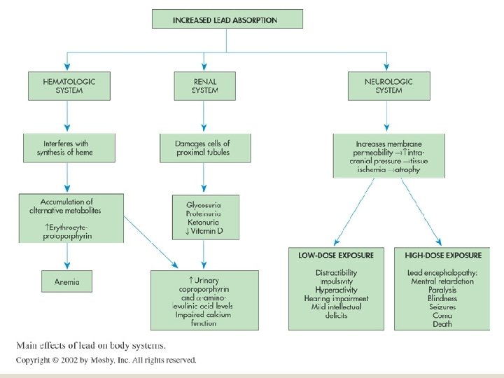 Sources of Lead Lead-based paint Lead soldering of cans ◦ Sealant Drinking water systems Eye cosmetics from other countries storage batteries kohl or kajol eyeliners Litargirio (lead monoxide) powder used as deodorant in Hispanics Bullets, curtain weights, and fishing sinkers made of lead Soil polluted by car exhaust or chipping house paint Ceramic glazes ◦ Mexican pottery Folk remedies ◦ Topical agents ◦ Alternative meds ◦ Chinese & Middle Eastern herbs for teething, colic, and GI d/o Toys and crayons made in China