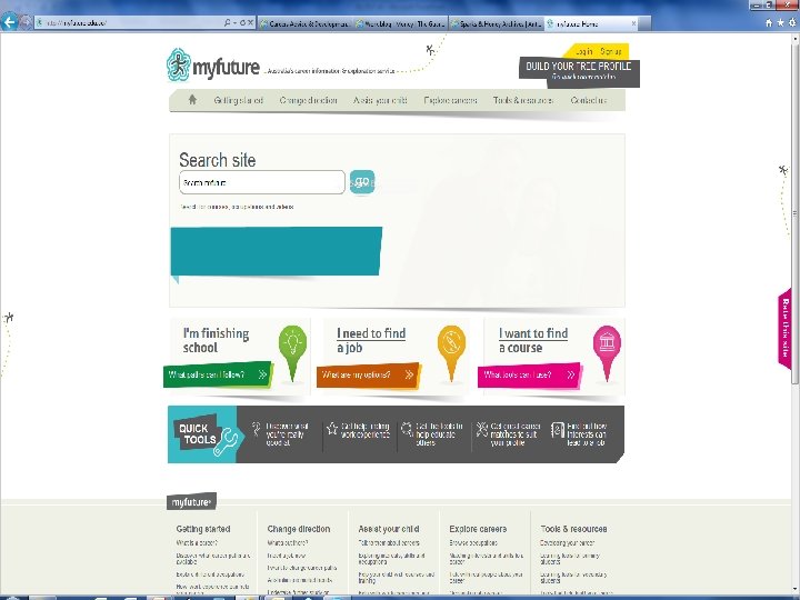 Find your path My Future ‘My career profile’ tool: www. myfuture. edu. au/myprofile Explore - Interests, Skills, Education and training, Work and study, Knowledge, Dream job, and Values