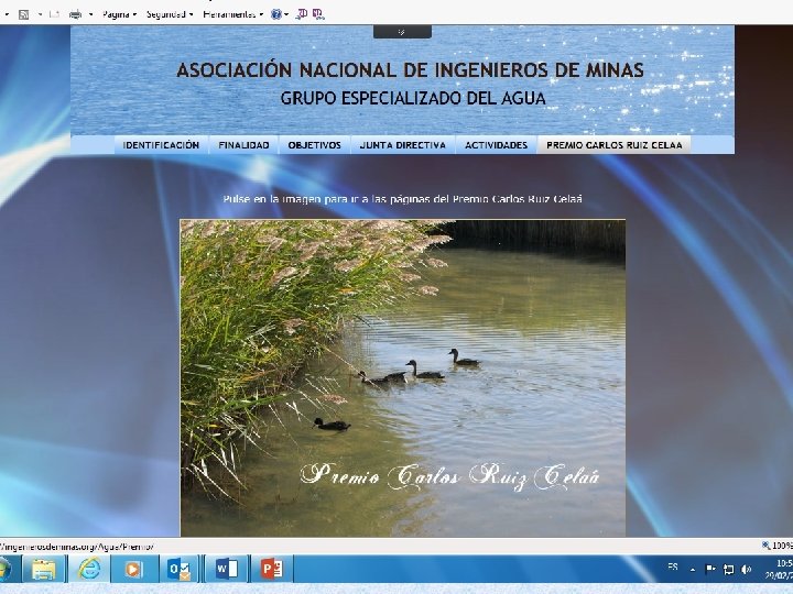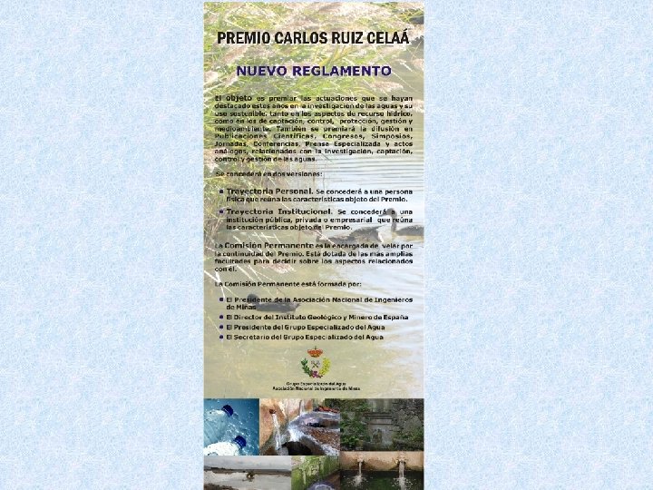 ACTUALIZACIÓN DEL PREMIO El espíritu y motivación del premio actualmente continúa siendo válido, pero es bien cierto que su reglamento necesita actualizarse periódicamente para adaptarlo a las situaciones del momento. Procedimiento: • El Grupo Especializado del Agua y la Asociación Nacional de Ingenieros de Minas preparan un borrador de nuevo reglamento. • La Comisión Permanente del Premio aprueba el Nuevo Reglamento el día 10 de febrero de 2016 y lo remite a la Asociación Nacional de Ingenieros de Minas. • La Asociación nacional de Ingenieros de Minas valida y prueba el Nuevo Reglamento del Premio, en su reunión del día 2 de marzo de 2016.