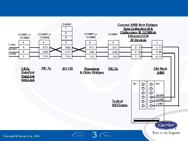 COMM 1 7 COMM 1 or COMM 2 6 5 COMM 1 or COMM 2 Current 6400 New Bridges Data Collection III & Chillervisor III CCNWeb COMM 1 Ethernet CCN 3 V Devices (G) WHT (+) RED 4 4 3 3 (-) 3 (G) 3 (-) 2 2 (G) 2 (-) 2 (G) 3 (G) 1 (-) BLK 1 (+) 1 (+) 4 (+) 203 FID Repeaters & Older Bridges CIO’s Data. Port Data. Link BACLink PIC I’s 4 1 PIC I’s Old Style 6400 RS - RS+ (G) GRN Typical VVT/Temp Copyright © Carrier Corp. 2008 3 (+) RED (-) BLK