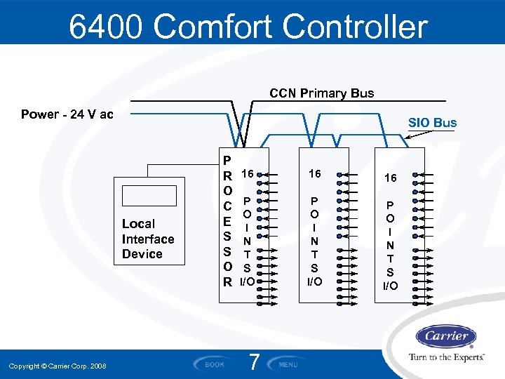 6400 Comfort Controller CCN Primary Bus Power - 24 V ac SIO Bus Local Interface Device Copyright © Carrier Corp. 2008 P R O C E S S O R 16 16 16 P O I N T S I/O 7
